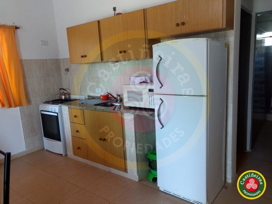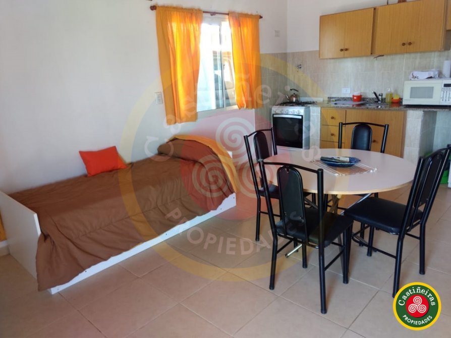 COCINA COMEDOR integrada, con artefacto de Cocina ( 4 hornallas con Horno ), mueble sobre mesada ( 3 puertas ) y bajo mesada ( 2 puertas y 3 cajones ), microondas, Heladera con freezer, Mesa redonda con 4 sillas, y dos camas de una plaza.