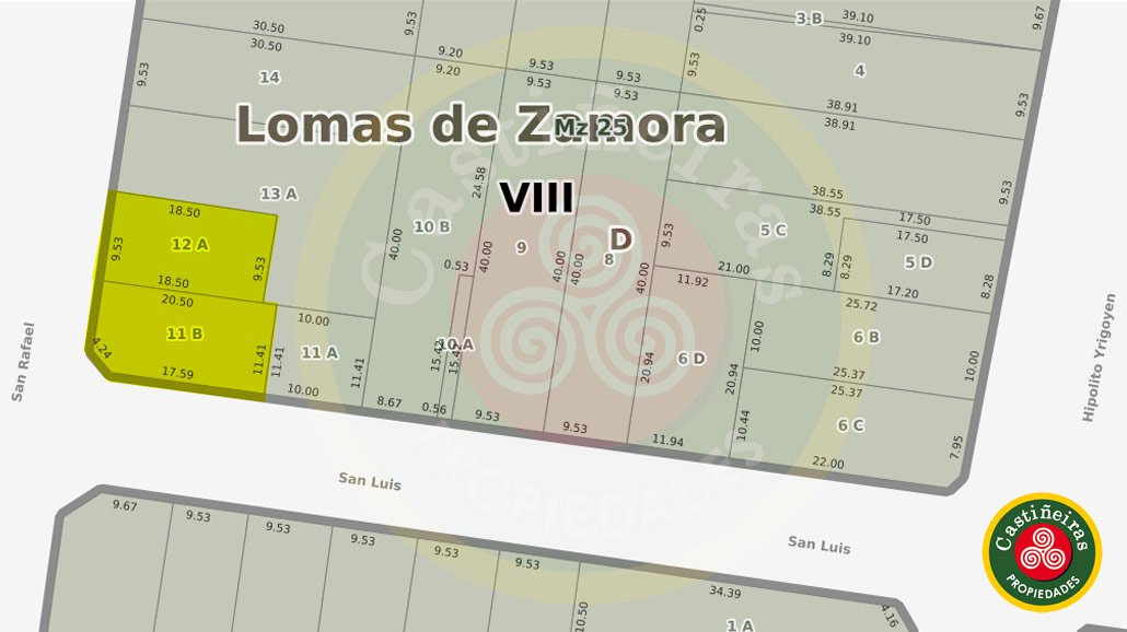 Frente sobre San Rafael 8.41 mts.; Sobre San Luis 17,59 mts.(Lateral); 4,24 (Ochava); 11.41 mts. (contrafrente) y 20,50 mts. (lateral) = 230 m2 aprox.