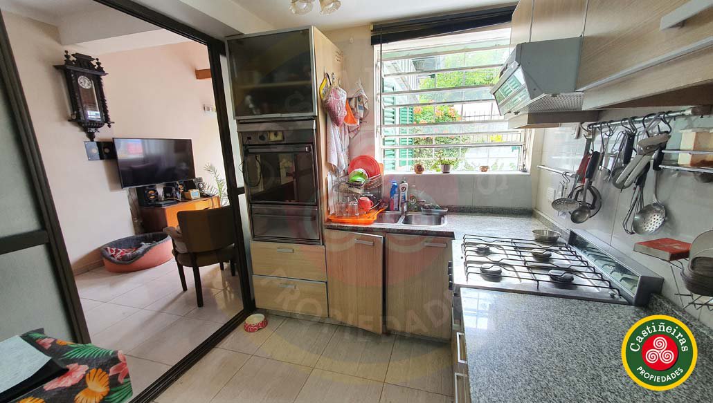 Cocina ( 2 x 5.50 ) piso porcelanato, ventana al exterior, con toda su mesada y mobiliario sobre y bajo mesada moderno.