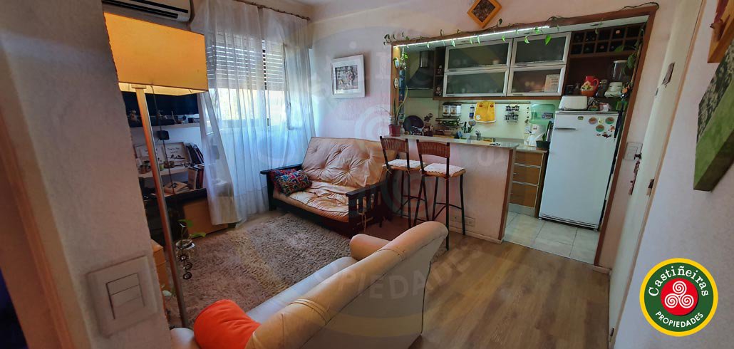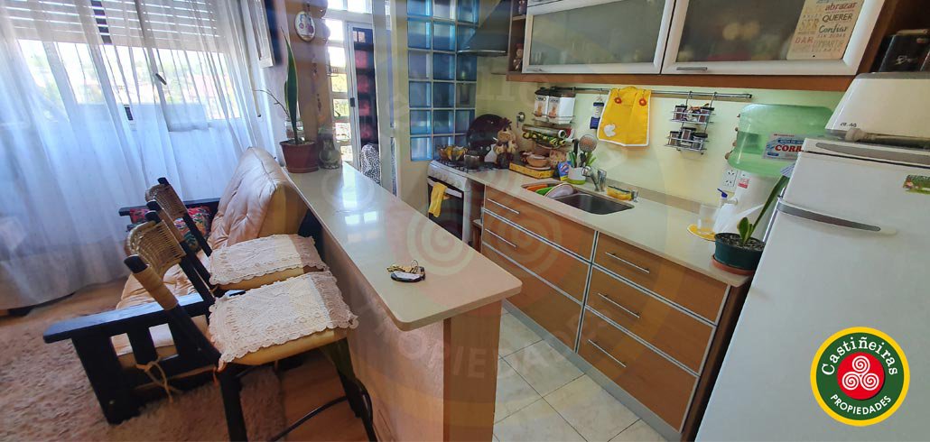 Cocina - Living-Comedor ( 4.46 x 3.82 ) con barra desayunadora de división. Calefón "Orbis".